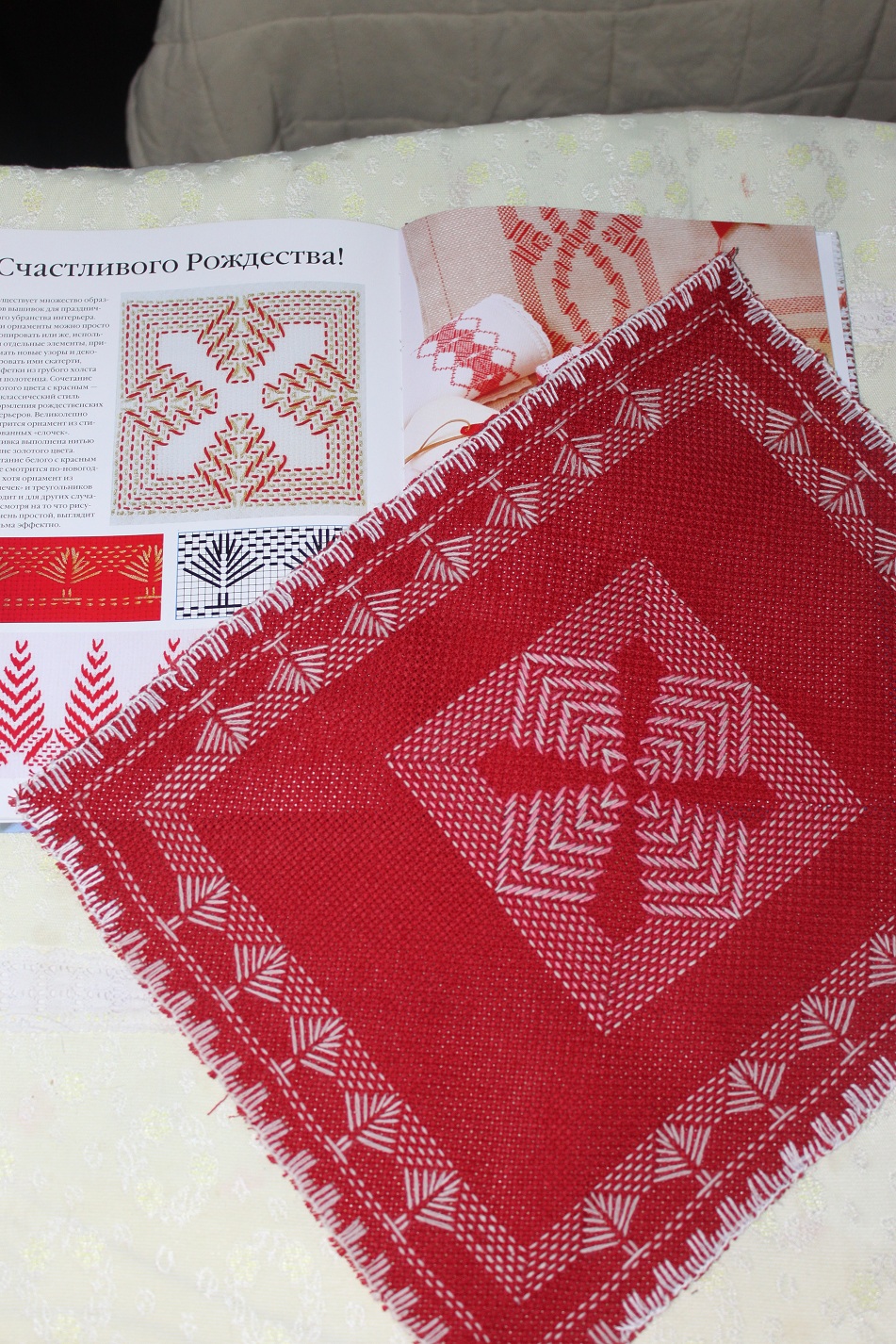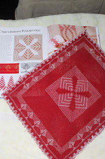 Салфетку вышивала дней 5, не торопясь.... Несколько раз переделывала из-за своей невнимательности. Сначала вышила одной нитью, на следующий день добавляла вторую. Но опыт получила бесценный. Результат очень порадовал.