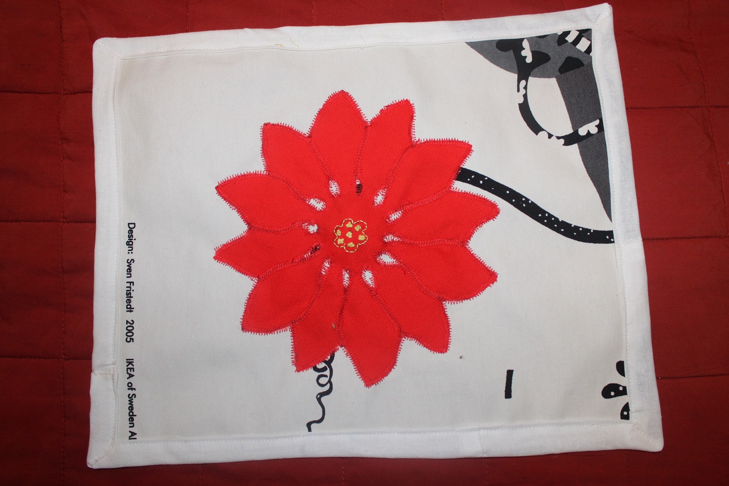 На странице РУКОДЕЛЬНИЦЫ МАСТЕРИЦЫ скачала новогодний журнал Сузанна. Очень мне понравились новогодние цветы на салфетках. У меня были два маленьких лоскутка для красных цветов. К тому же пришлось отменить ручную обработку краев, так как материал был очень плотным и я исколола все пальцы, только приметав их. Воспользовалась швейной машинкой.